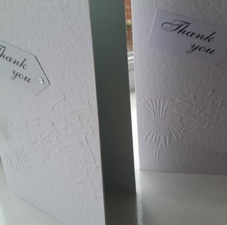 A completely handmade and uniquely designed pack of cards. Using quality pristine white card a design of dandelion head and seeds blowing in the breeze. One edge has several embossed lines to add interest. The seeds have been !Ightly silvered. Finished off with a thank you tag with crystal.