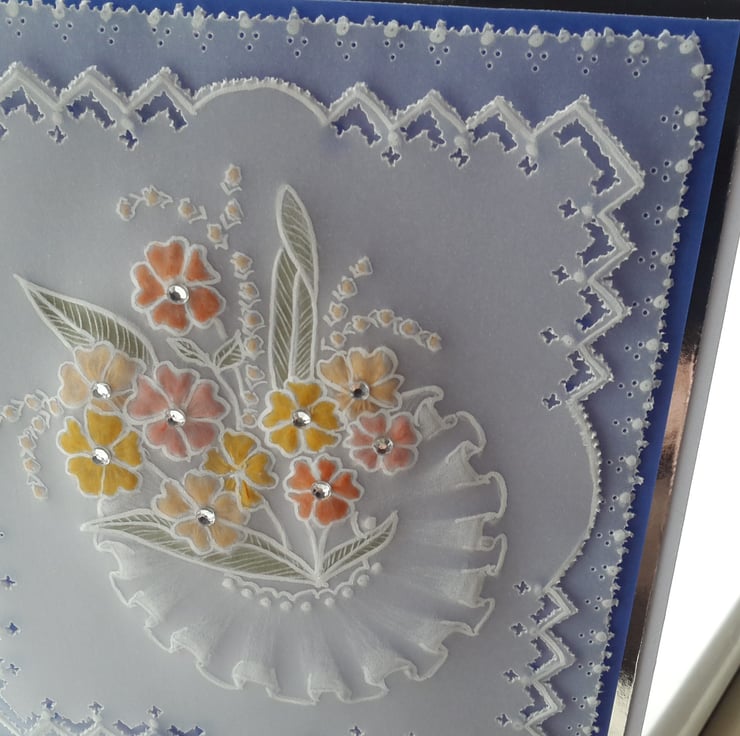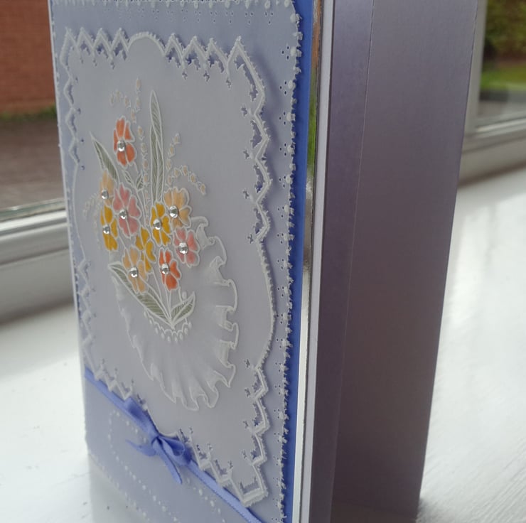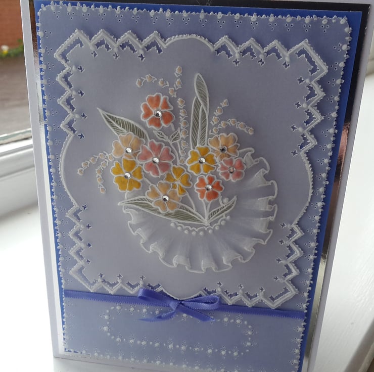 A completely handmade and uniquely designed card. Consisting of a pretty design of a posy cut, pierced and embossing onto parchment paper. Hand coloured in orangey tones and with pretty efficient GS. Mounted onto another piece of decorated parchment paper. A rectangle has been left blank for a name or date or message. Mounted then onto lavender blue vellum then onto silver Morris card a d then onto quality pristine white card. Finished off with crystals f!Left centres and lavender blue ribbon and how.