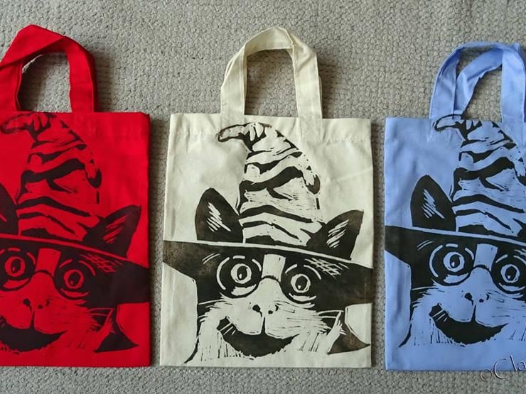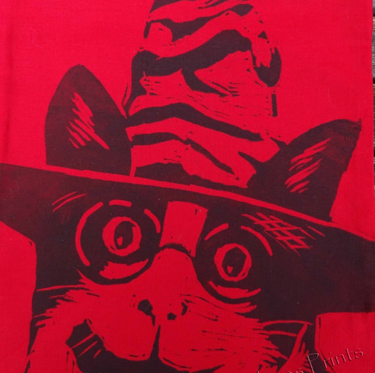 Linocut print of a cute cat in burnt Umber oil based ink.
