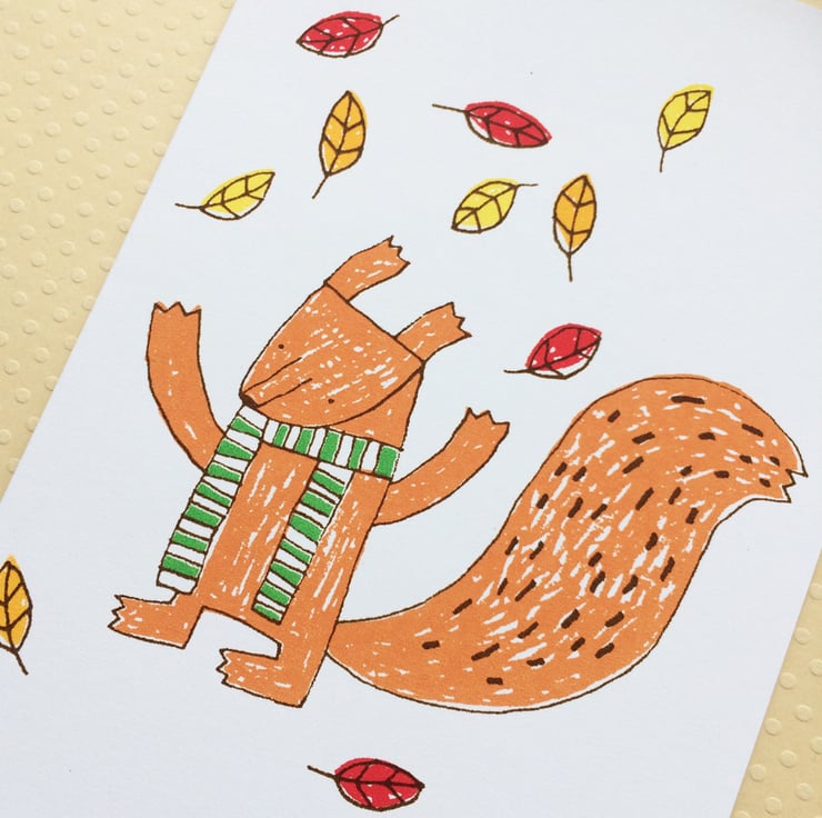 'Squirrel' is a drawing I took from my sketchbook and transformed it in to a colourful screenprint.