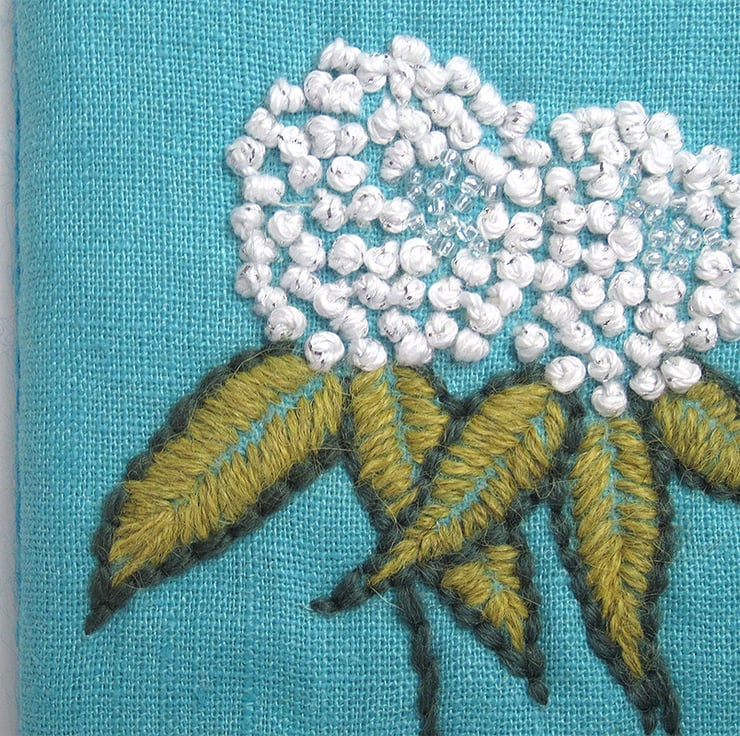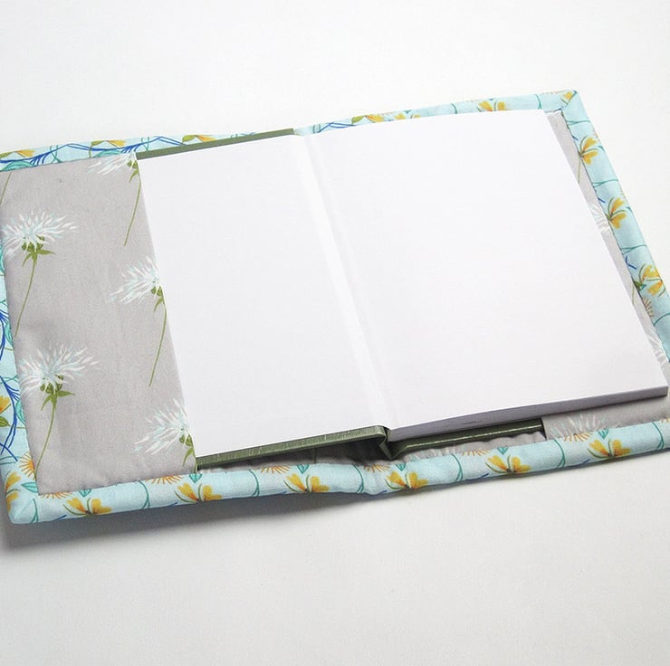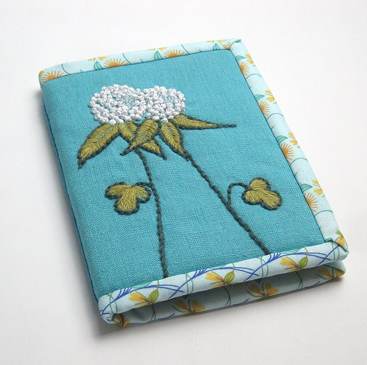 This A6 notebook cover is made in turquoise linen fabric and has a hand embroidered clover on the front. The edge and the inside are trimmed with my own floral prints (thistle and marigold designs). The notebook tucks inside the jacket so you can replace the notebook once it is used up. The item comes supplied with a lined A6 notebook.