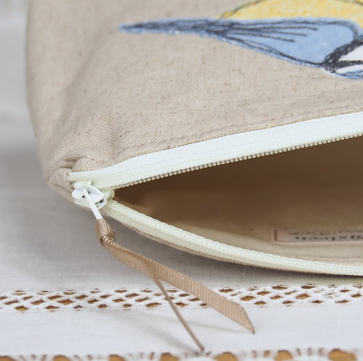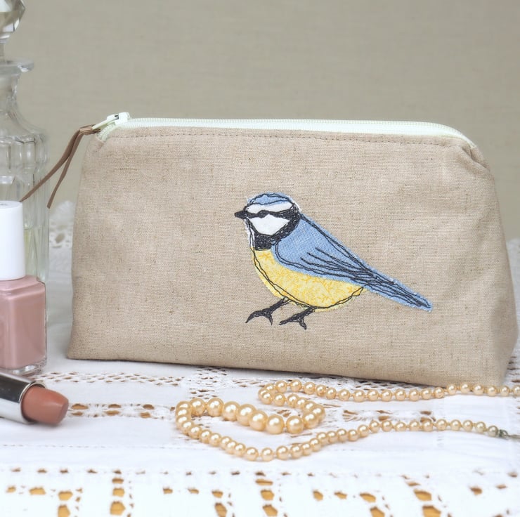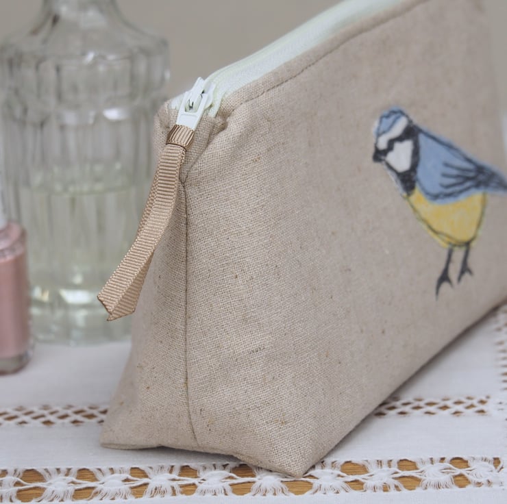 This beautiful Make Up Bag is made from a Japanese Linen fabric with a plain cotton lining and has a zip fastening. It features one of my own unique designs and is stitched using the Freemotion Machine Embroidery technique.