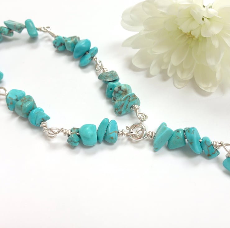 This bracelet is made from sterling silver using a wire wrapping technique and pretty turquenite chips. It is finished with a sterling silver bolt ring clasp. The clasp may be fastened in different places depending on wrist size.