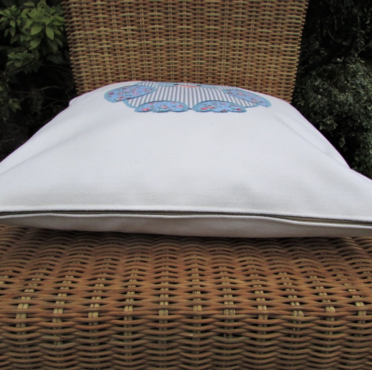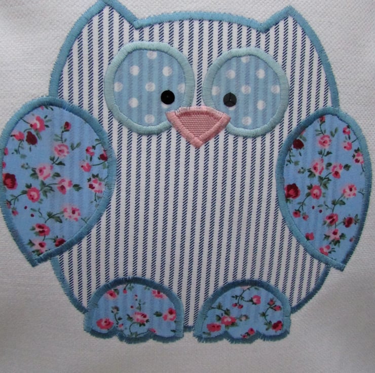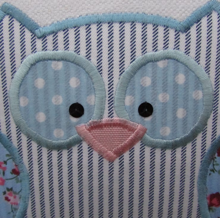 This owl cushion is made from an ivory coloured fabric with a cute applique owl in pastel shabby chic style fabrics. The main body of the owl is a white and blue striped fabric and the wings and feet are blue with a ditsy floral pattern in shades of pink and green. The owl has a pale pink beak and eyes which are pale blue with white polka dots, embellished with black sequins.