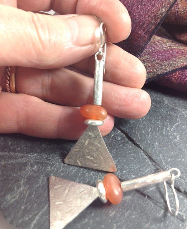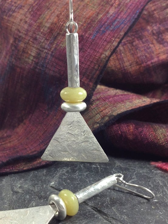 Triangles of silver have been beaten for texture, these are stacked with silver and jade beads, then topped with distressed tube beads and hung from handmade hooks.