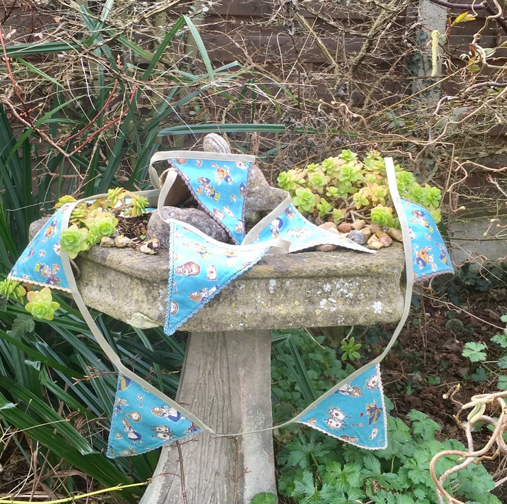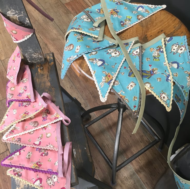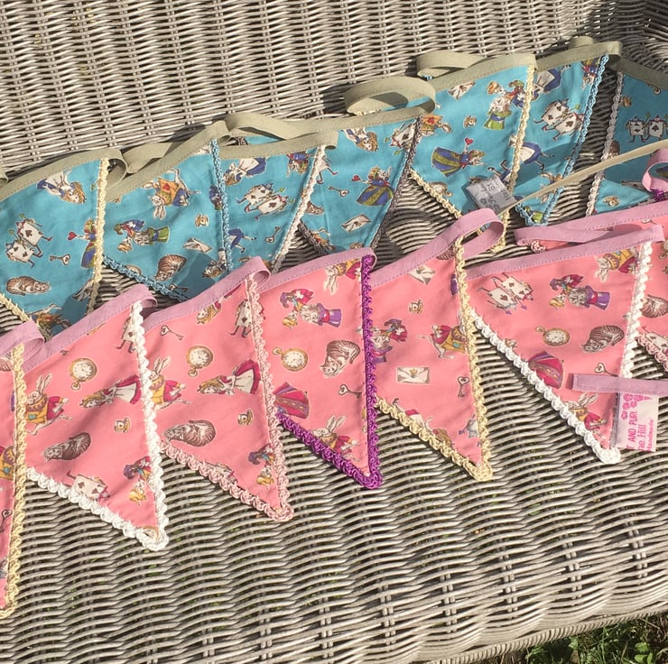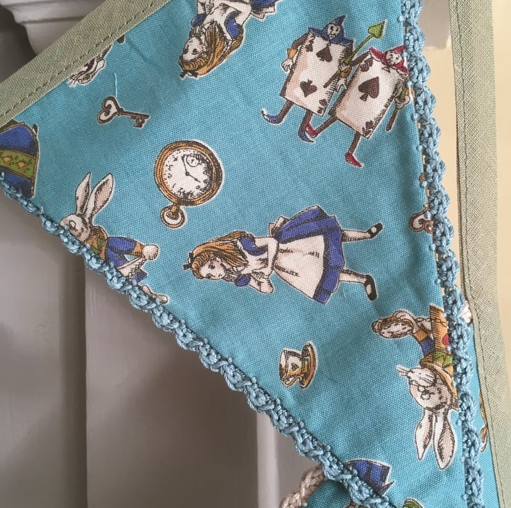 Alice in Wonderland fabric Bunting. The Bunting is made up of ten flag pennants in Alice characters. Each pennant has a co-ordinating crochet trim.