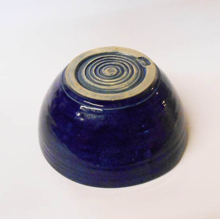 It has been hand painted with shiny deep sea blue on the interior, and stripes have been applied in several layers of navy blue glaze using a wax resist method.