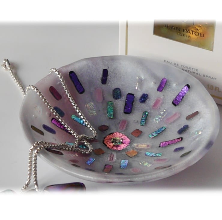 This round dish has a base of opaque streaky lavender glass topped with a layer of very special iridescent clear glass with a silver sparkle. This makes the top surface lovely and shimmery.
