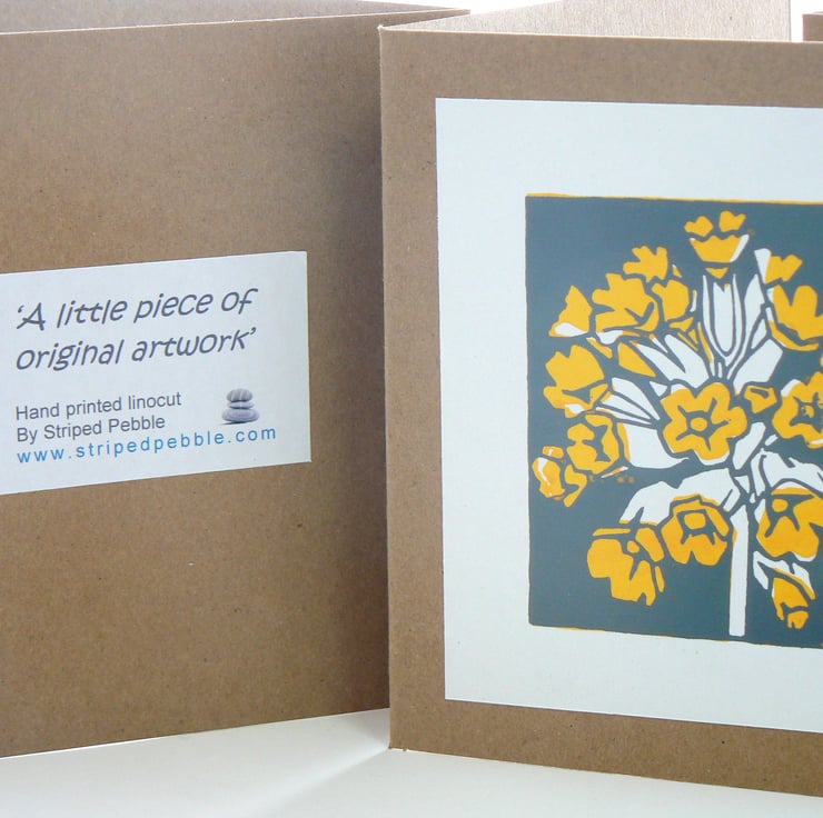 Our mini prints each measure 8cm square, printed on cartridge paper and mounted on a square recycled card with matching envelope. The card is blank inside for your own message.