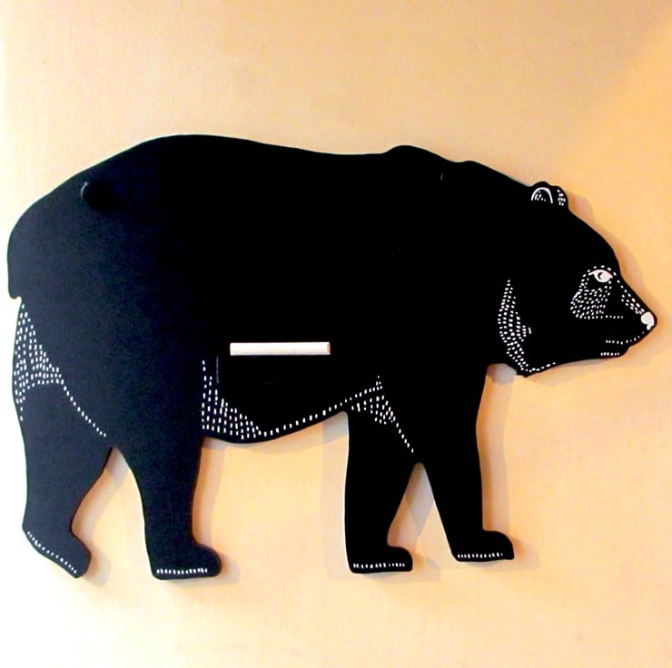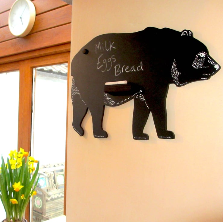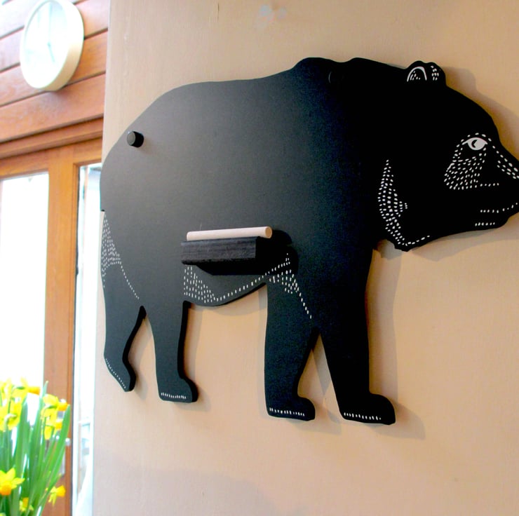 A Bear shaped chalkboard, hand screen printed with 1 colour (white on black). Perfect to brighten up a kitchen or childrens bedroom. Designed for use with liquid or solid chalk. A fun design, a perfect gift for any bear loving person!