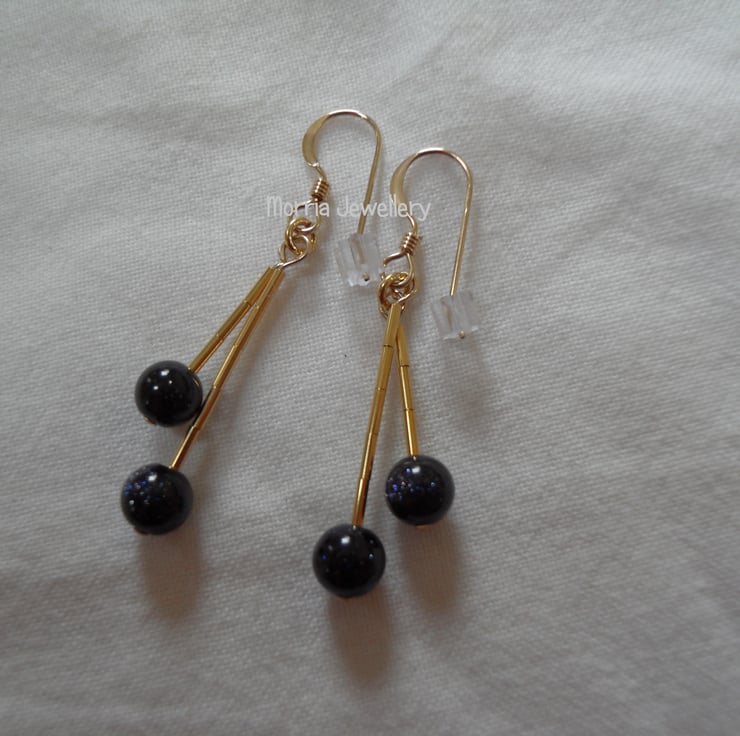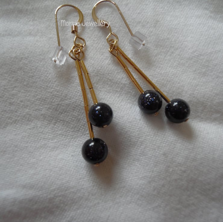 Blue 6mm goldstone beads are threaded on a gold-fill headpin with tiny gold-fill tubes to create these stunning earrings.