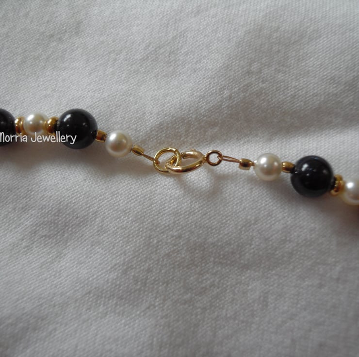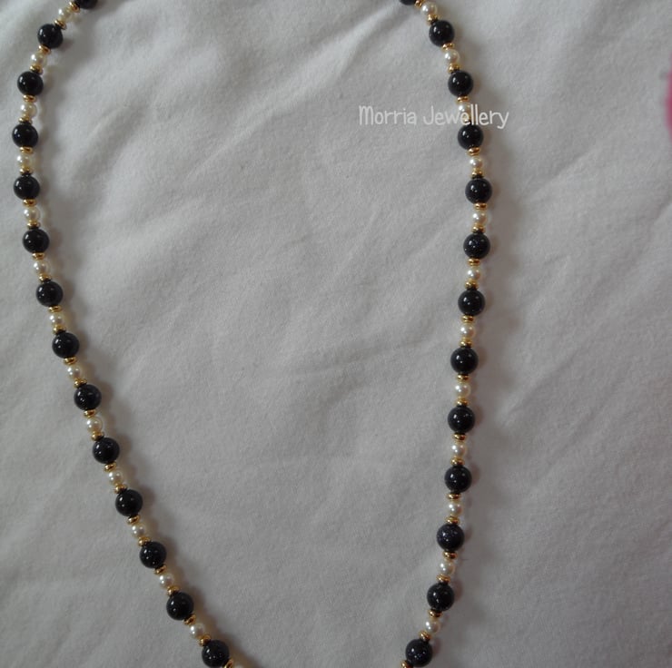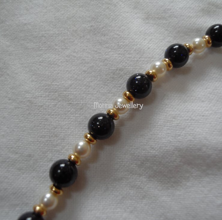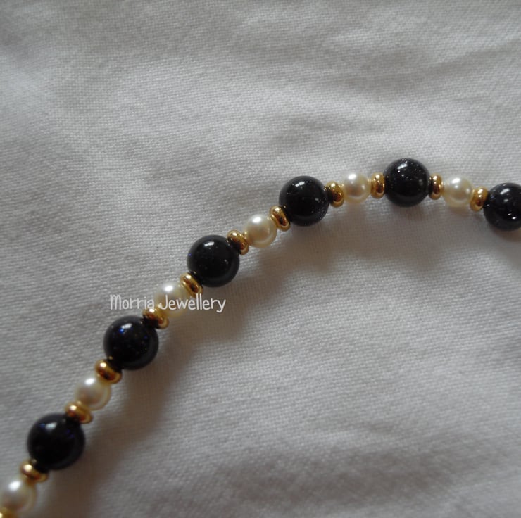 This beautiful necklace is made from 6mm blue goldstone beads, 4mm white high end crystal pearls and gold-fill rondelles.