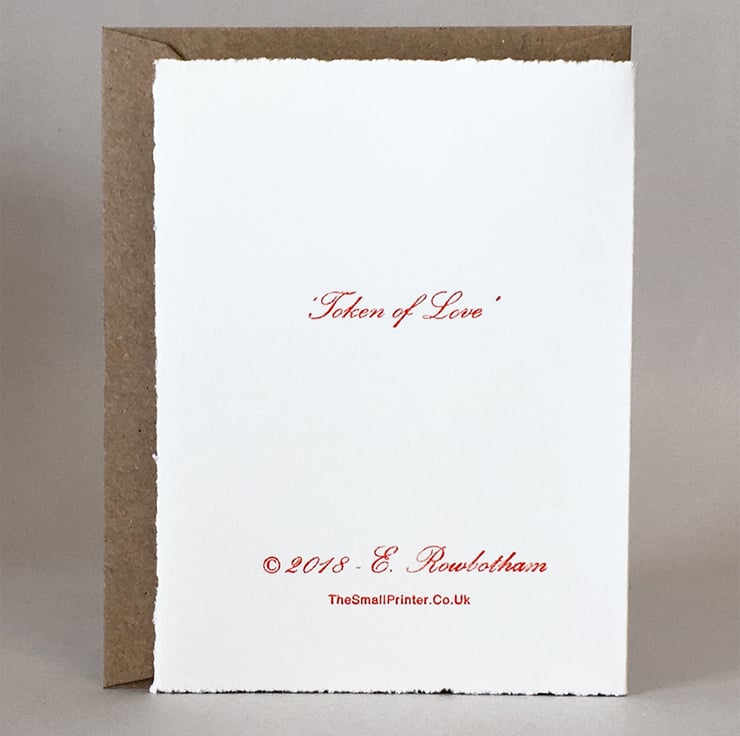 An original letterpress hand-printed card on gorgeous-to-touch specialist, traditionally made, Artist Quality Paper which is torn to size by me & hand folded ensuring the precious 'deckle edge’ (a property of the ancient paper-making method) is included