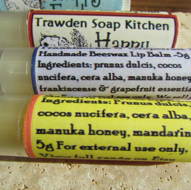 My base ingredients work to nourish and protect lips. It has a glossy feel & glides smoothly on. These beauties are: Organic Coconut Oil, sweet Almond Oil, English Beeswax & Manuka honey. Tiny amounts of essential oil / vanilla provide natural flavouring.