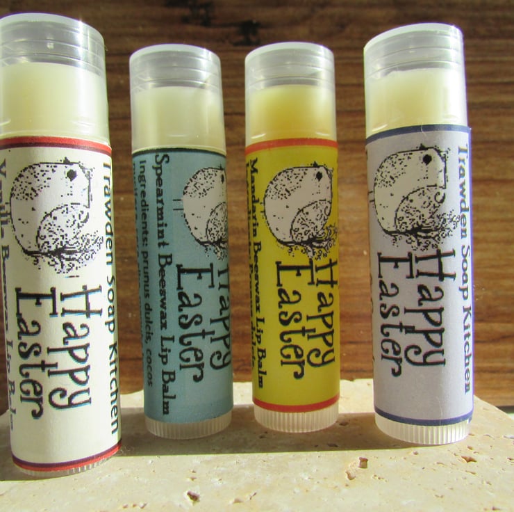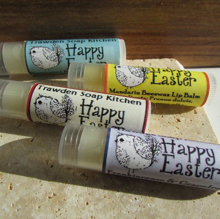 My best selling beeswax lip balms, packaged for Easter with cute little chicks. Artwork by Kimma Parish. You will get four 5g filled lip balm tubes.