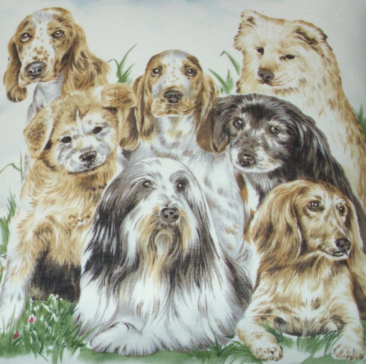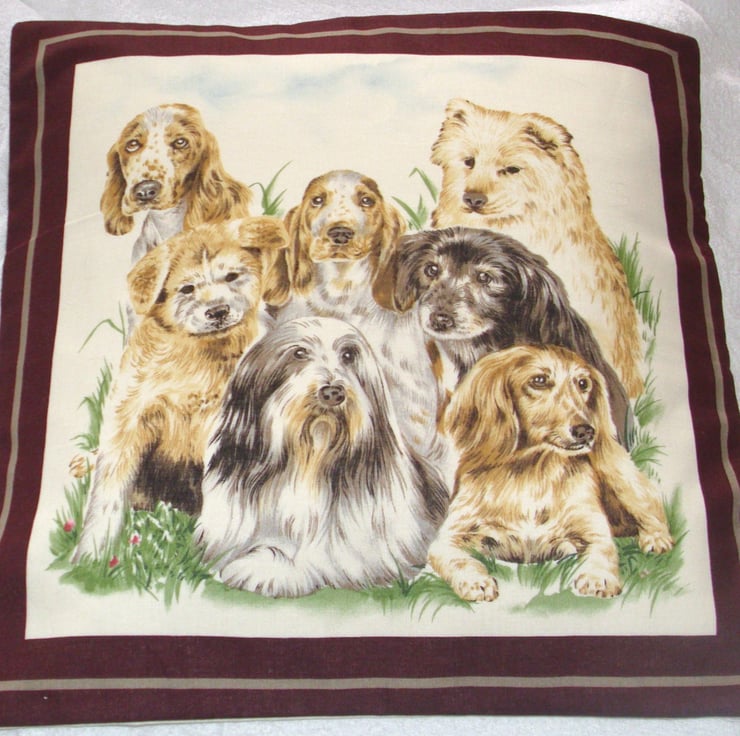 A square cushion, puppy dogs meeting, with a spaniel, daschund, bearded collie and friends sitting on the lawn in the garden waiting for some fun. would look good in any lounge, sitting room, study or office on any settee or armchair or in a conservatory or summer house or on a bed.