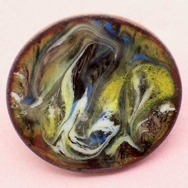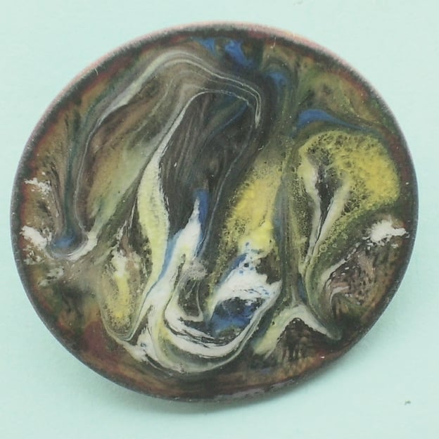 I have made it by first building up layers of clear enamel on the copper shape. I then scattered pools of white, yellow and blue enamel on this coat and when the piece was at red hot in the kiln I disturbed the surface with a steel rod to draw the colours into the random scrolled pattern. depending on the direction and intensity of light striking the brooch thecopper base shows through in tones of golden-brown.