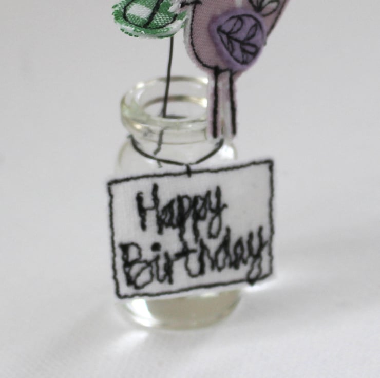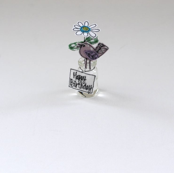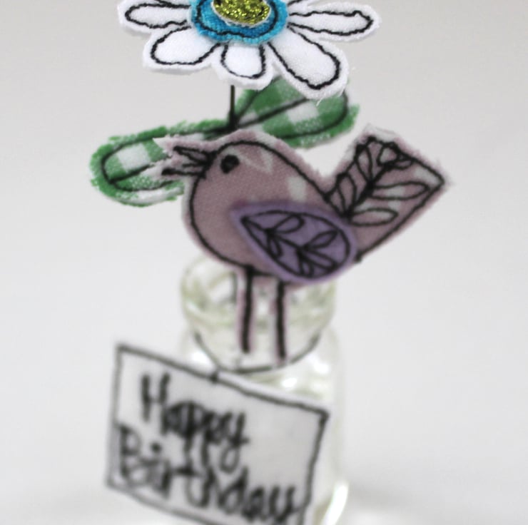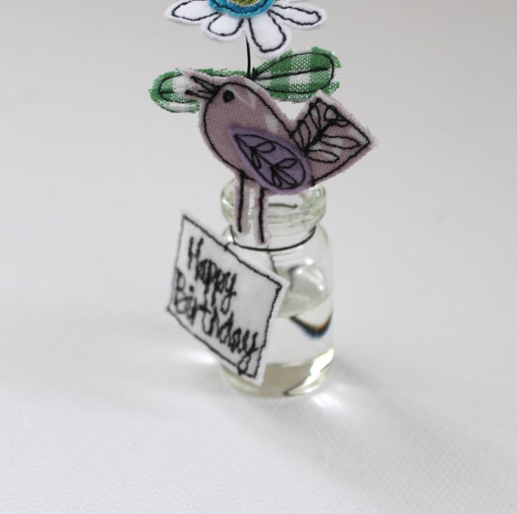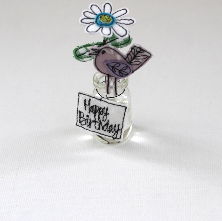 The flower and leaves are created using sewn fabric with a wire stem holding them in position in acrylic water. Satnding next to the flower is a fabric birdie and around the bottle neck hangs a sewn fabric label saying 'Happy Birthday'.