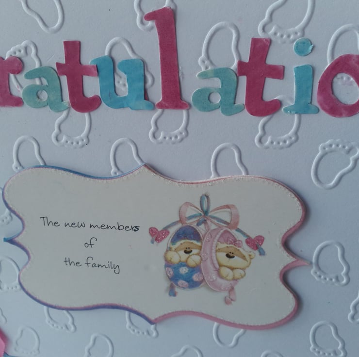 A completely handmade and uniquely designed card. Consisting of quality pristine white card which has been embossed with a cute design of tiny baby toes. A topper with cute Blue and pink bootees. Embellished with a double satin ribbon bow in pink and blue. Finished off with congratulations and two s die cut from co ordinating colours