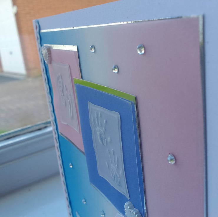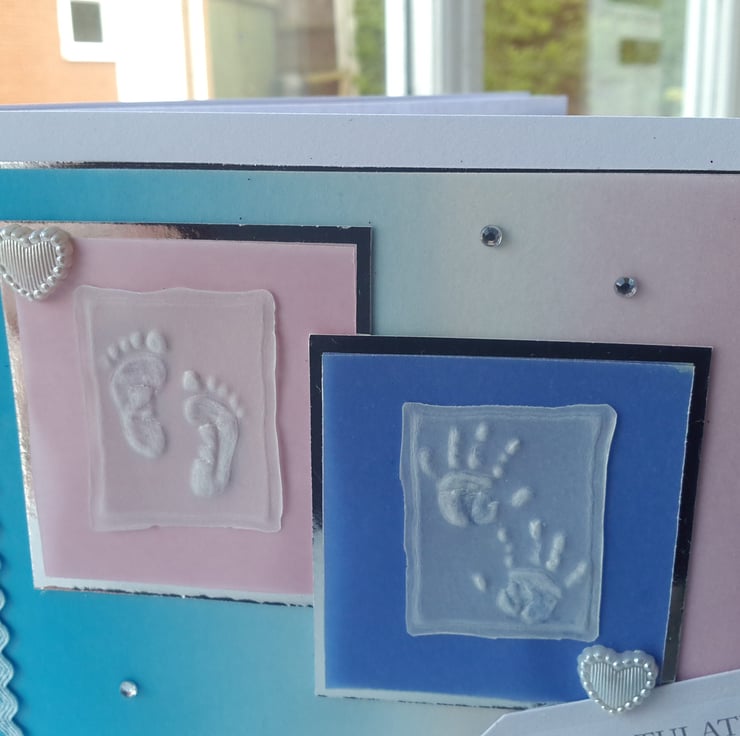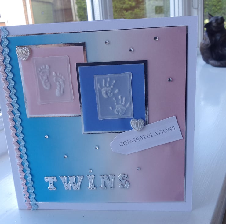 A completely handmade and uniquely designed card. Consisting of two rectangles one with baby feet and the other with baby hands embossed onto parchment, mounted onto pink and blue vellum then onto silver Morris card. Then mounted onto shared vellum then silver mirri then onto quality pristine white card. Embellished with two pearl hearts, rhinestones, congratulations tag and twins die cut from silver card. Finished off with a double row of pink and blue Ric fax ribbon