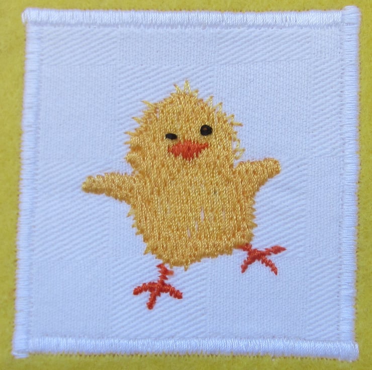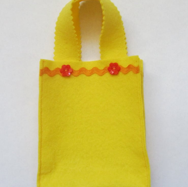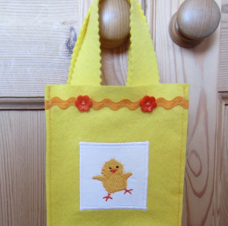 Sweet little yellow felt bag decorated with machine embroidered chick panel, orange ric rac and flower buttons.