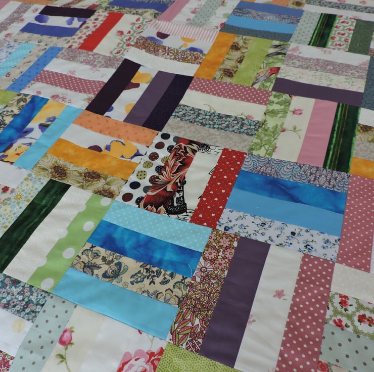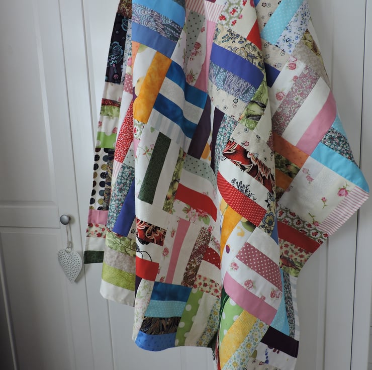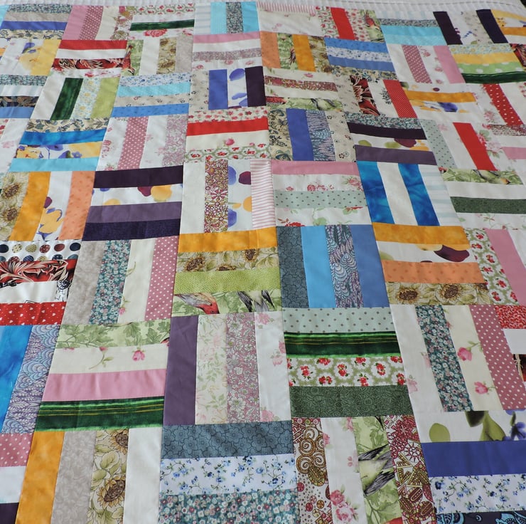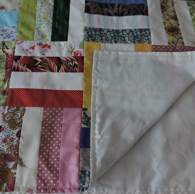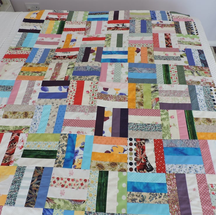 This patchwork throw has been made with 320 cotton strips, sewn together in groups of four and then pieced together alternately vertically and horizontally. An unpadded throw with a plain cream medium weight cotton backing.