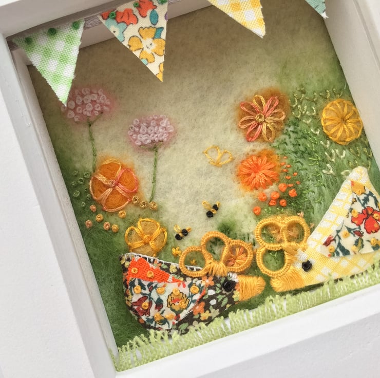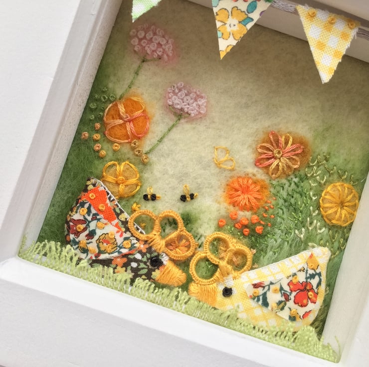 This design has been created using needle felting and hand embroidery. Two fabric chicks called Geraldine and Alice are strolling in this hand stitched flower border. Each chick has a tiny piece of Liberty fabric for their wings and I have also used teeny printed fabrics for the bunting.