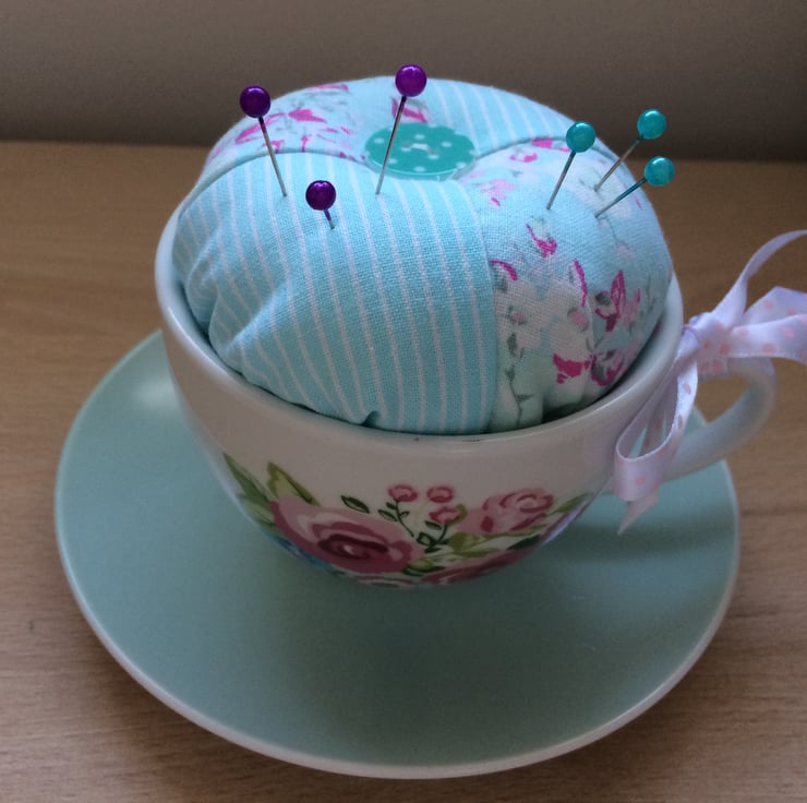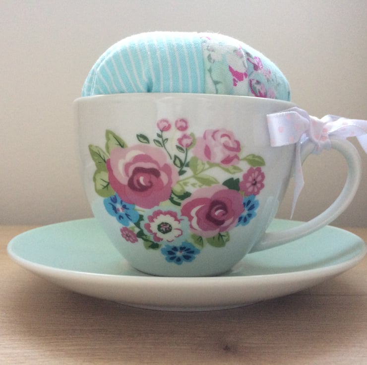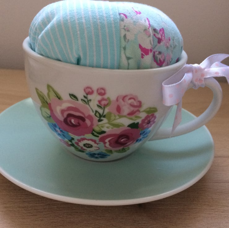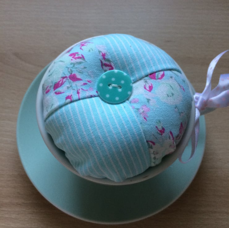The pin cushion has been made using contrasting fabrics that compliment the Cup and Saucer giving it a Vintage look.