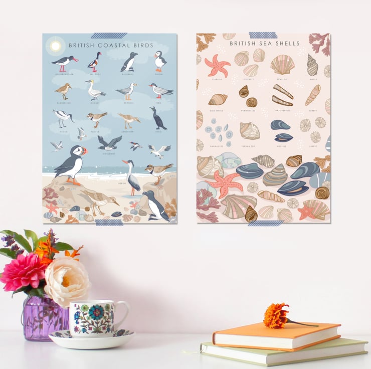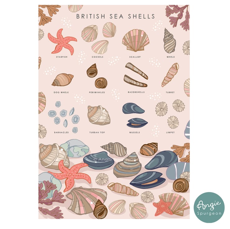 British Sea Shells Poster in a nature field guide format. This would make a lovely gift for a nature lover who loves to be by the sea. Based on my original illustrations, it's pretty design & cheerful colours would brighten any wall and instantly bring a bit of the outdoors inside.