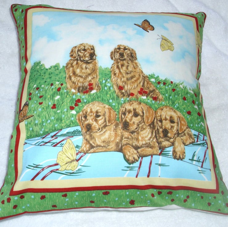 A Square cushion with a beautiful family of Golden Retrievers sitting in the garden, the parents sitting behind with three cuddly pups lying on a blue rug in front, butterflies are also flying about, and red poppies and pretty blue flowers are in the grass and round the outside of this bright colourful cushion . lovely and soft cushion ,would look good in any lounge, sitting room, study or office on any settee or armchair or in a conservatory or summer house or on a bed.