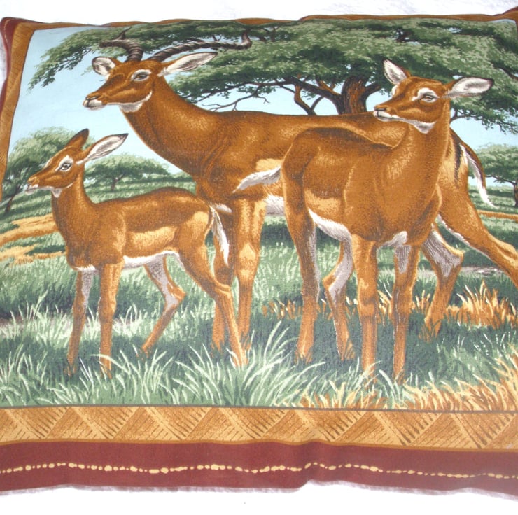 A square On Safari cushion with a family of Gazelles standing under trees. would look good in any lounge, sitting room, study or office on any settee or armchair or in a conservatory or summer house or on a bed.