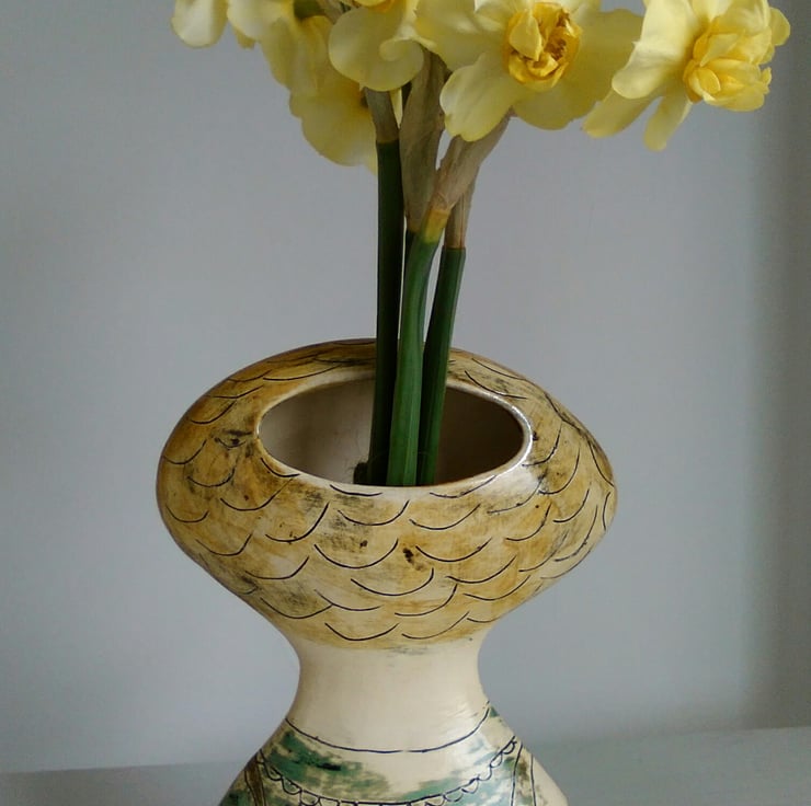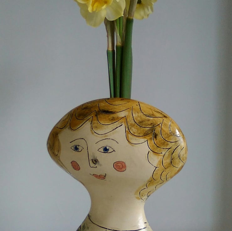 Handmade in earthenware clay this figurative vase measures 23cm high and is painted with coloured slips. Ceramic transfers of flowers and a bee on her nose.