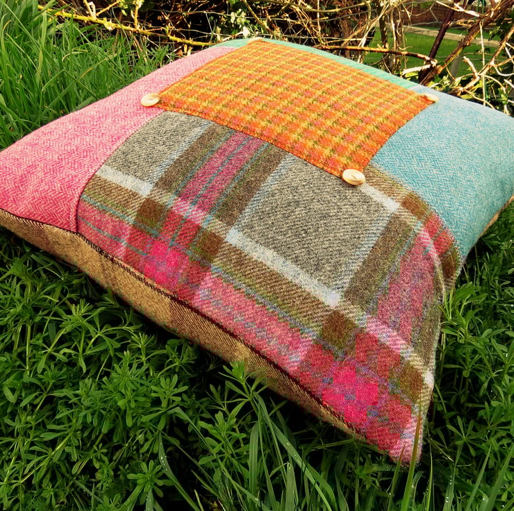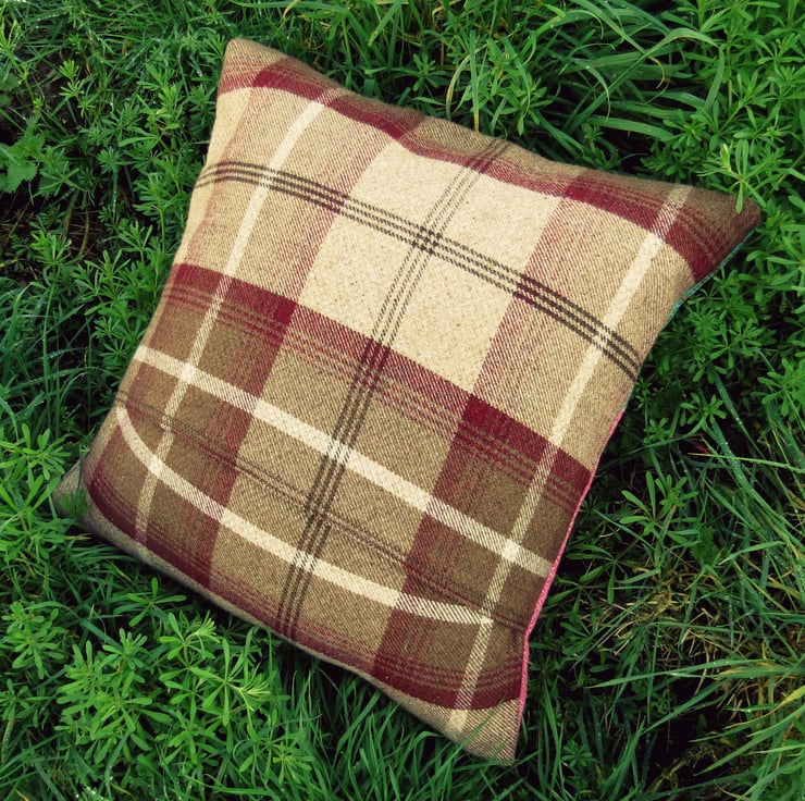 There is a deep envelope opening to the reverse, which is a heavy tartan wool.