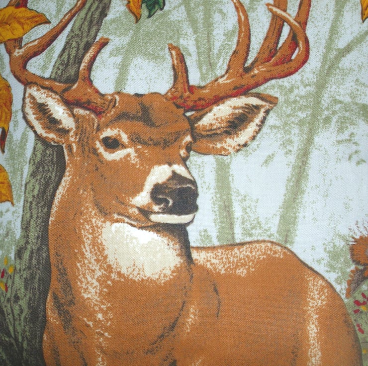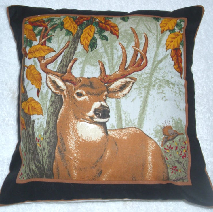 A square cushion with a Stag facing front right in an Autumnal forest. lovely and soft cushion ,would look good in any lounge, sitting room, study or office on any settee or armchair or in a conservatory or summer house or on a bed.
