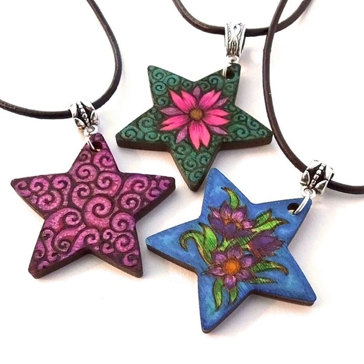 I have been experimenting with using layers of colour with my pyrography, using ink, prismacolor, and posca markers and sometimes acrylics. If you'd like a pendant specially created, just get in touch!