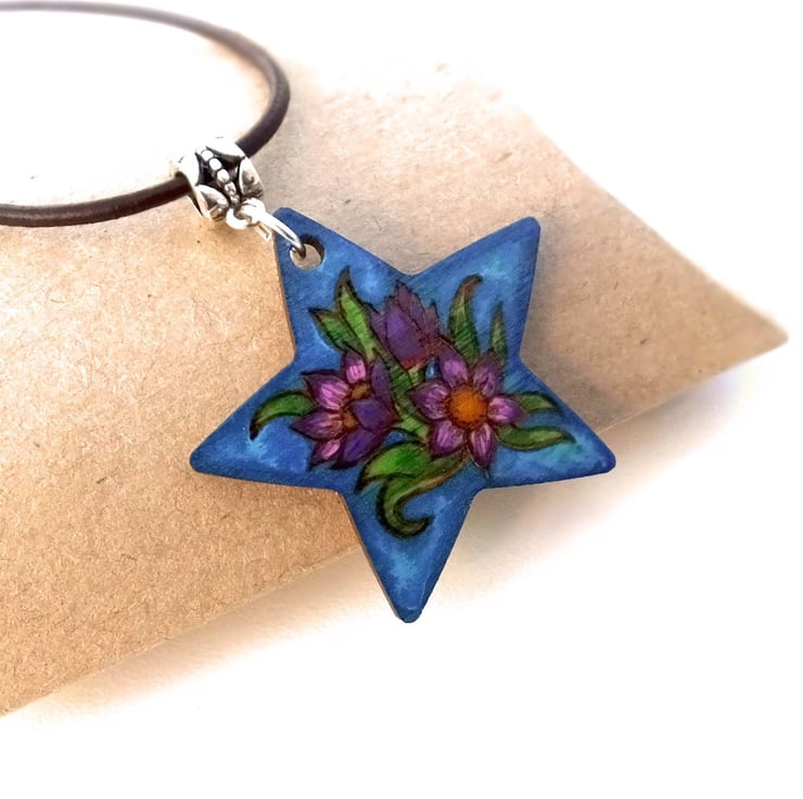 A lovely small star shaped wooden pendant, with a small arrangement of flowers, hand burned using pyrography and hand coloured with beautiful shades of blue, purple and green inks and pencils, along with some posca pen.
