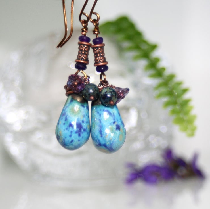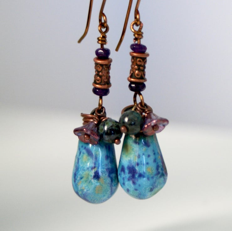 They are accented with patterned copper tubes and purple magnesite rondelles, purple shimmery Czech glass flowers and mottled green Picasso round beads. They are finished with my own handmade earwires in antique bronze.