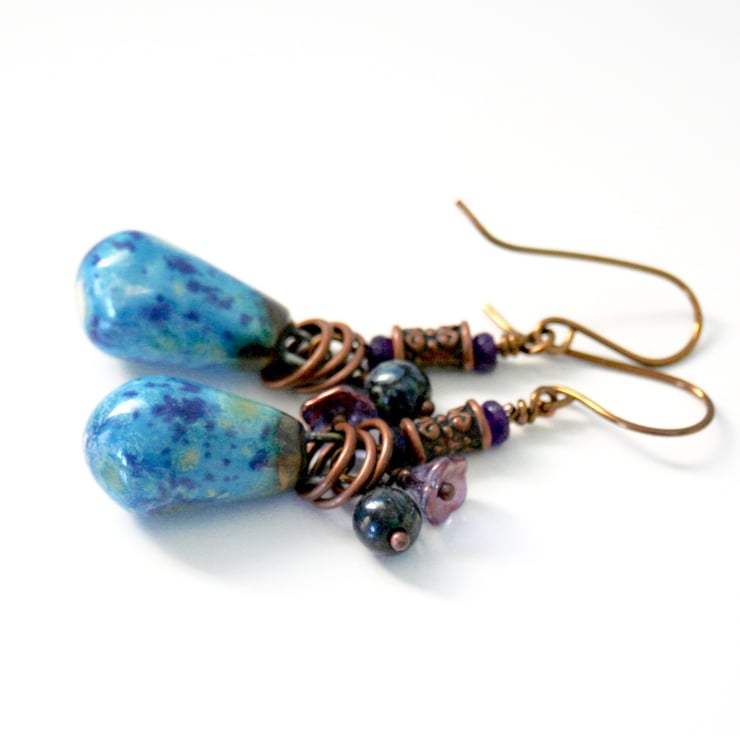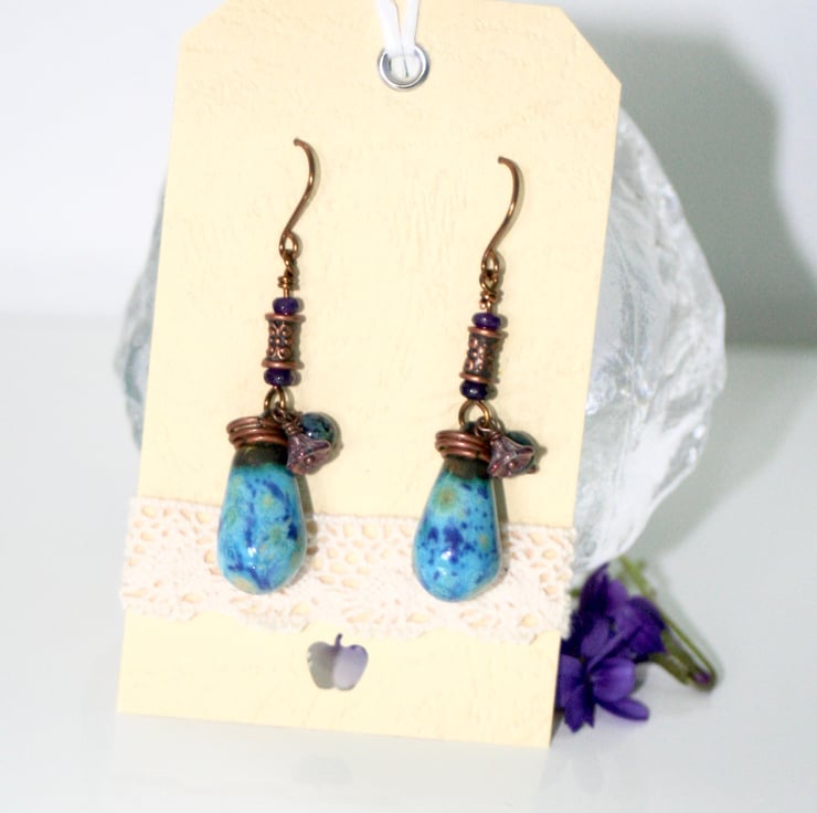 Pretty mottled blue ceramic drops from Scorched Earth are the focal of these earrings.
