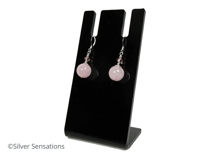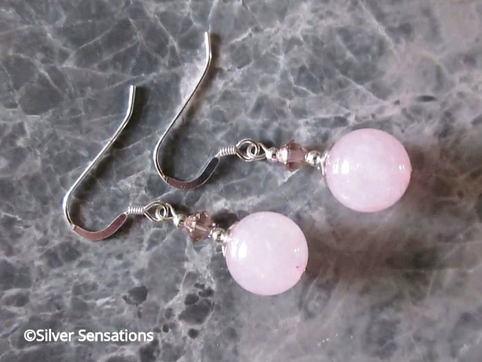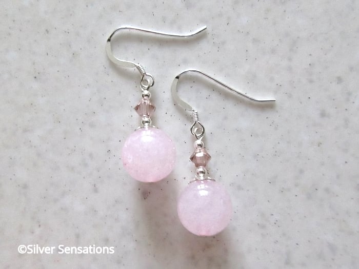 Elegant & feminine, these handmade ladies Rose Quartz earrings have 10mm baby pink round semi precious gemstones.