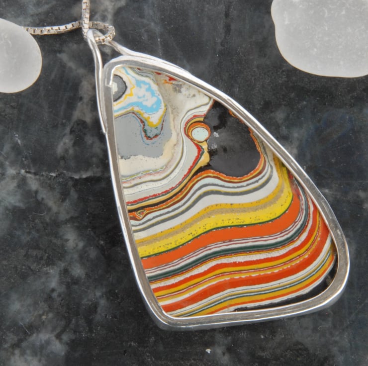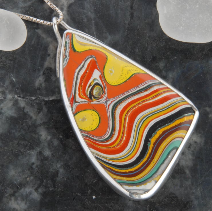 This large irregular triangle shaped pendant features a sizable cabochon of fordite bezel set in sterling silver. The open back setting means that the pendant is reversible and can be worn either way round to show off the differing patterns. The fordite has a swirly pattern in predominately oranges, yellows and white on one side and a stripy pattern on the reverse with more white and grey in it. Fordite is many layers of paint that built up in the old manual spray booths and based on the colours and thickness of the bands in this material I believe it came from a commercial vehicle paint shop, probably in Dagenham, in the 70's. Since the changes to the way vehicles are painted in the mid 80's this material is becoming increasing difficult to source (especially the stuff from British spray booths). I cut and polish this material myself (see the final photo for the rough slab that this piece came from which obviously formed round a pipe), it takes 3 grades of file, 6 of polish paper and plenty of elbow grease but it comes up with a lovely deep sheen. I have more of this rough if you want a different shape pendant or other pieces to coordinate with it just drop me a message and I'll see what I can do.