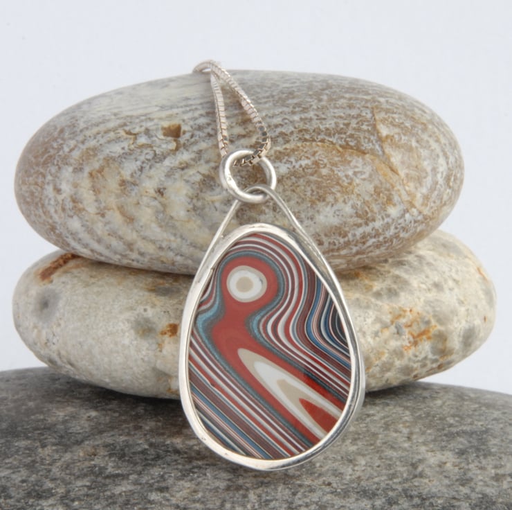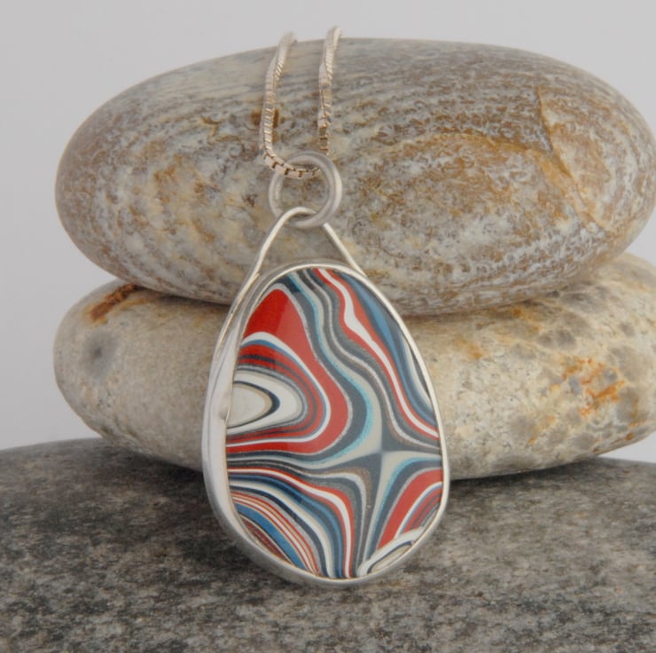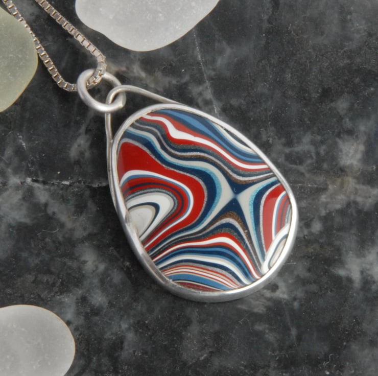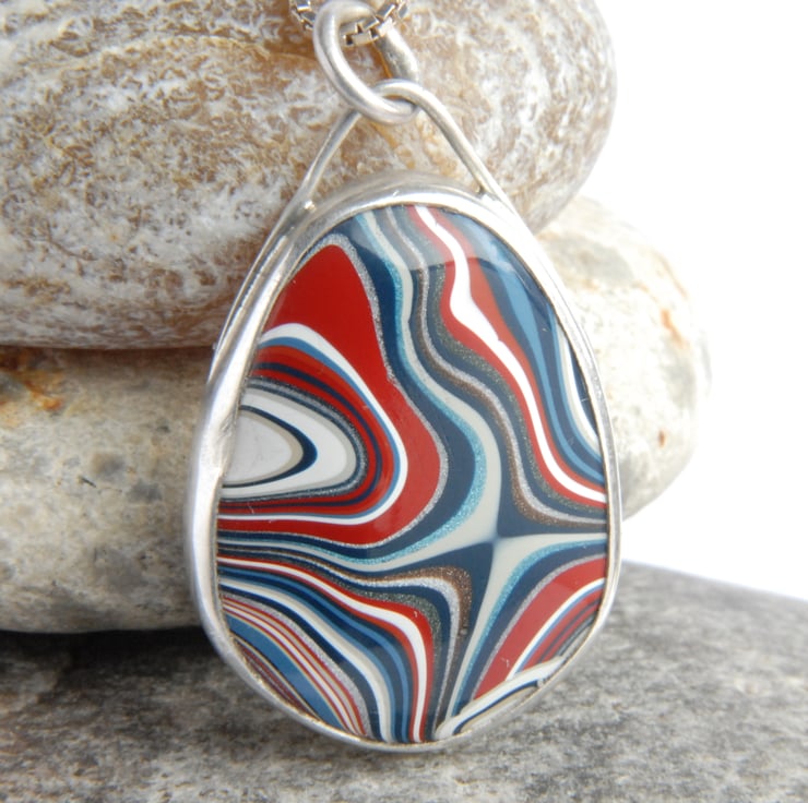 This pendant features one of my last pieces of Dagenham fordite bezel set in sterling silver with an open back so that you can wear the pendant either way round. The 'front' has a cross like swirly pattern in blue, red and white with a few bands of sparkly turquoise and silver, the 'back' has more red and tighter bands of blue and white. What's fordite? Fordite is the name given to the material formed as car paint built up layer upon layer in the old manual spray booths - once it had been baked the accumulation would be periodically chipped off and someone realised it could be cut and polished to give wild patterns. This material came from Ford's plant in Dagenham in the 70's or 80's I believe and this material is incredibly hard to source since they changed the way in which cars are sprayed in the mid 80's and it isn't formed any more. Would make a wonderful gift for anyone who loved their cortina or escort back in the day (if you are after a specific colour let me know and I'll see if I can find it in my dwindling stash).