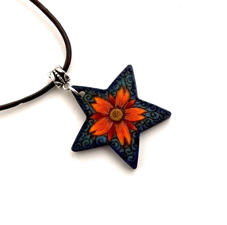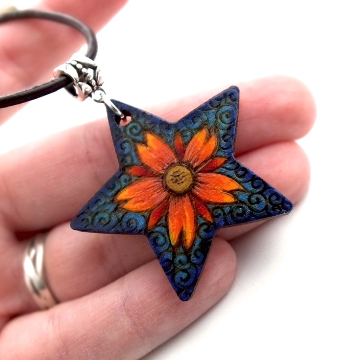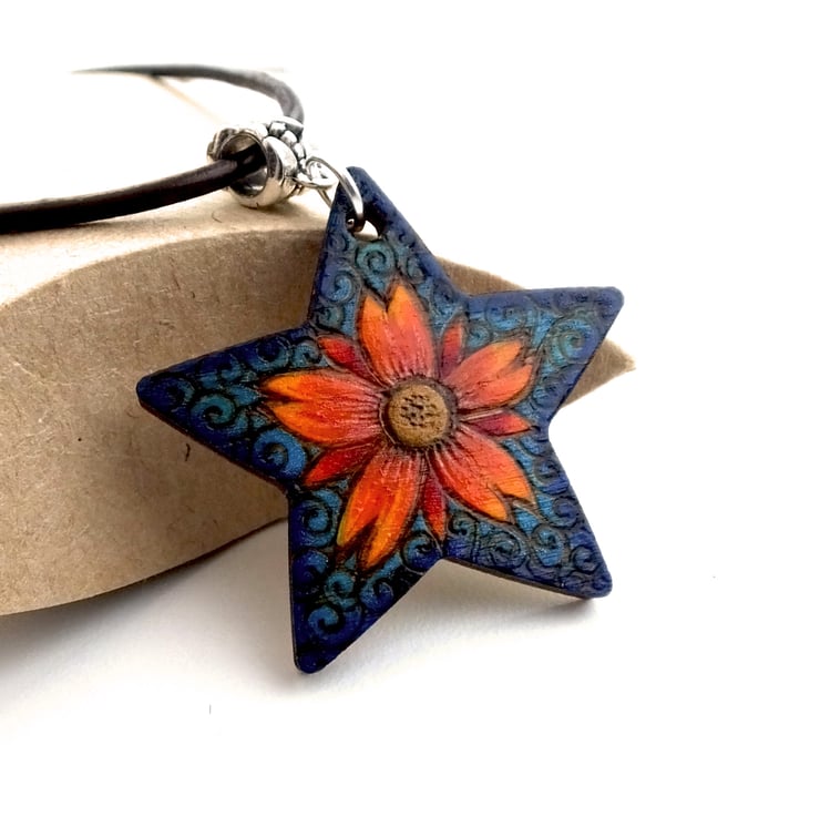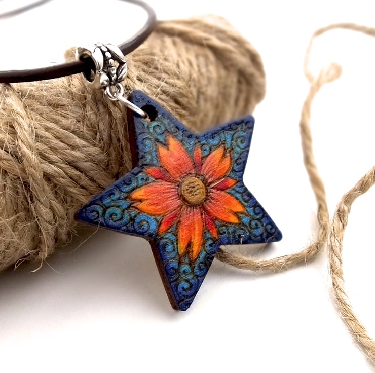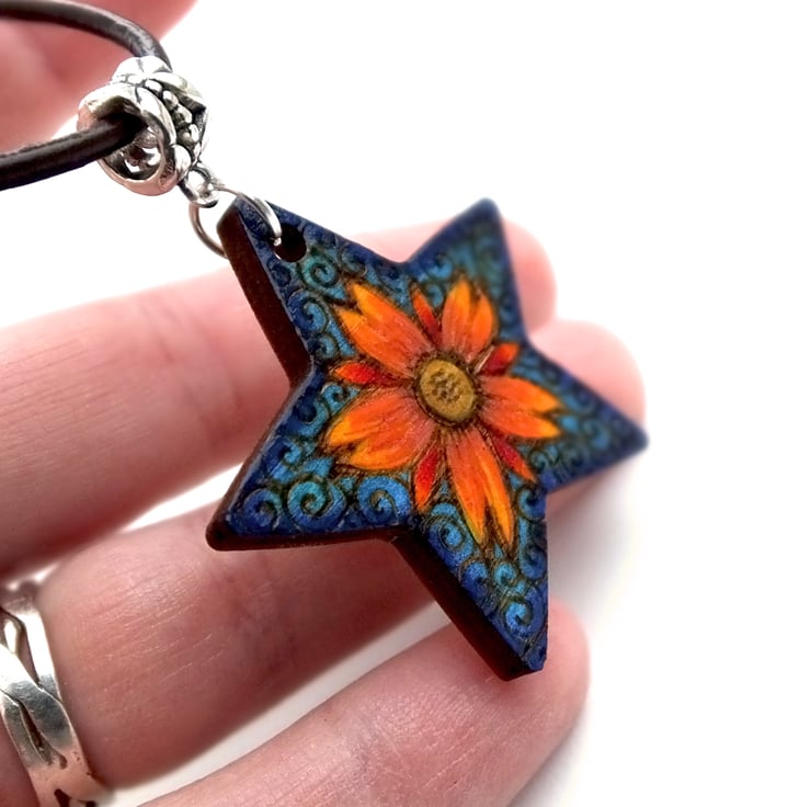A lovely small star shaped wooden pendant, with an orange star flower, hand burned using pyrography and hand coloured with beautiful shades of blue, orange and red inks and pencils, along with some posca pen.