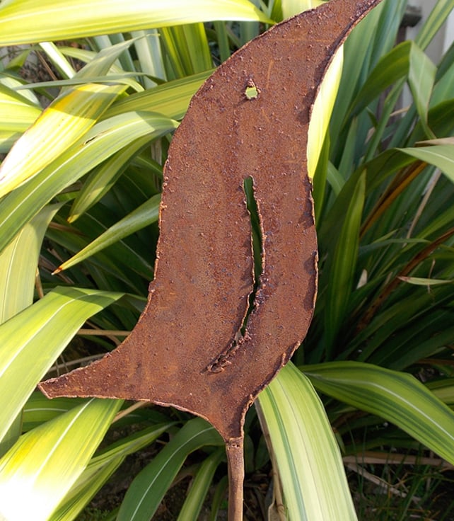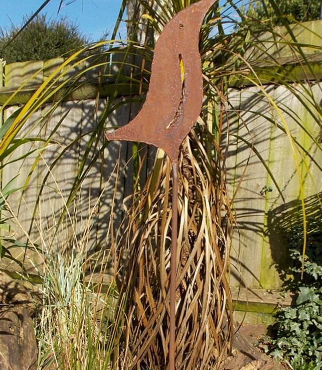 Rustic metal plant support hand cut with a plasma torch from mild steel. The sculptured bird plant support is approx 36" tall. Is individually made so there are slight differences between each.