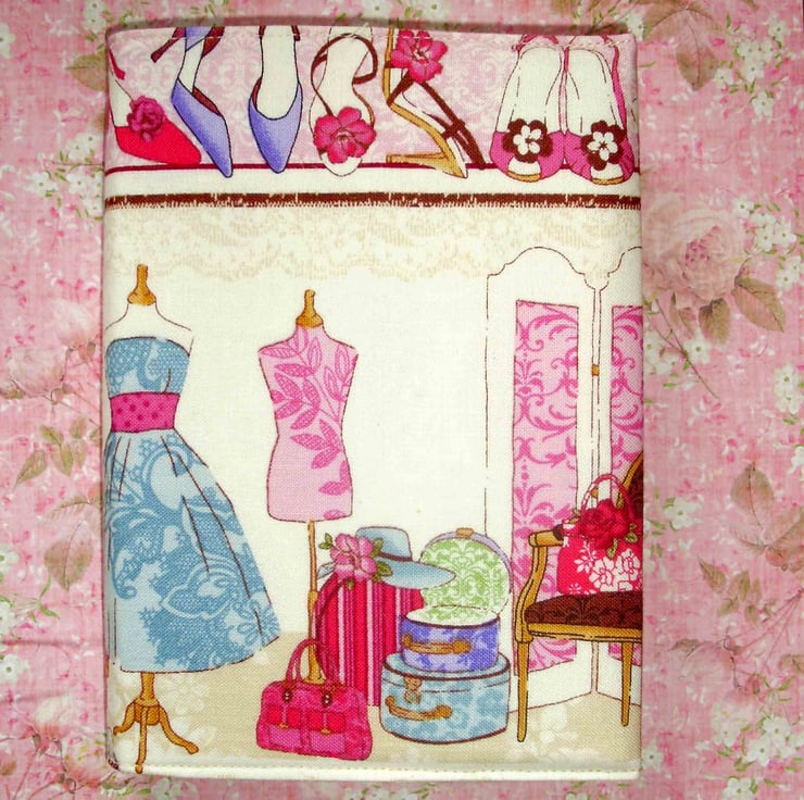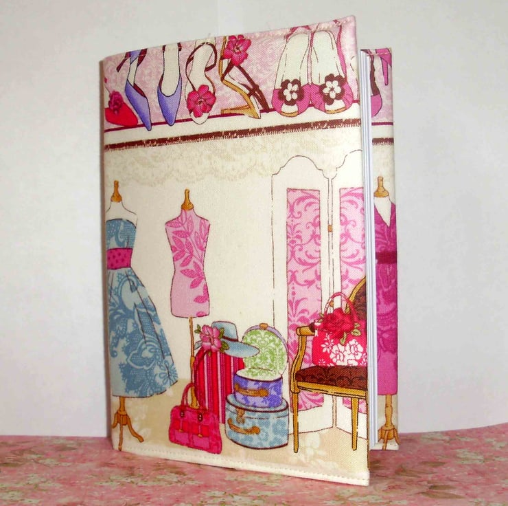 This is a very pretty A6 notebook, with good quality lined paper, which has been covered with fabric featuring dresses, shoes, hat boxes etc. The cover is interfaced and lined in plain cream, and can be removed, and a replacement notebook fitted when needed.