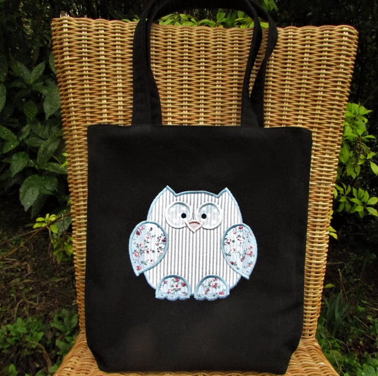A cute owl tote bag in black fabric with an adorable applique owl in pastel shabby chic style fabrics. The main body of the owl is a white and blue striped fabric and the wings and feet are blue with a ditsy floral pattern in shades of pink and green. The owl has a pale pink beak and eyes which are pale blue with white polka dots, embellished with black sequins. . The bag is fully lined with fabric which matches the main body of the owl.