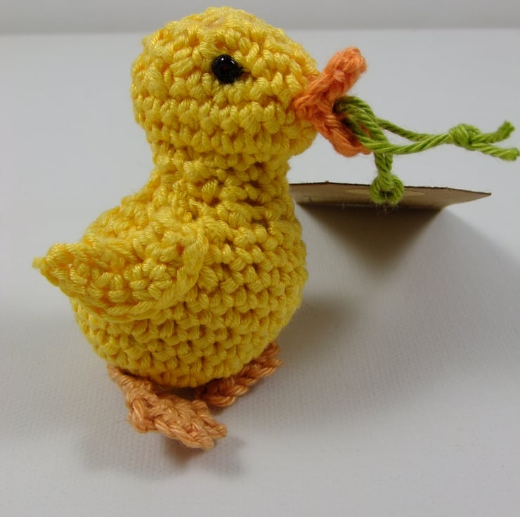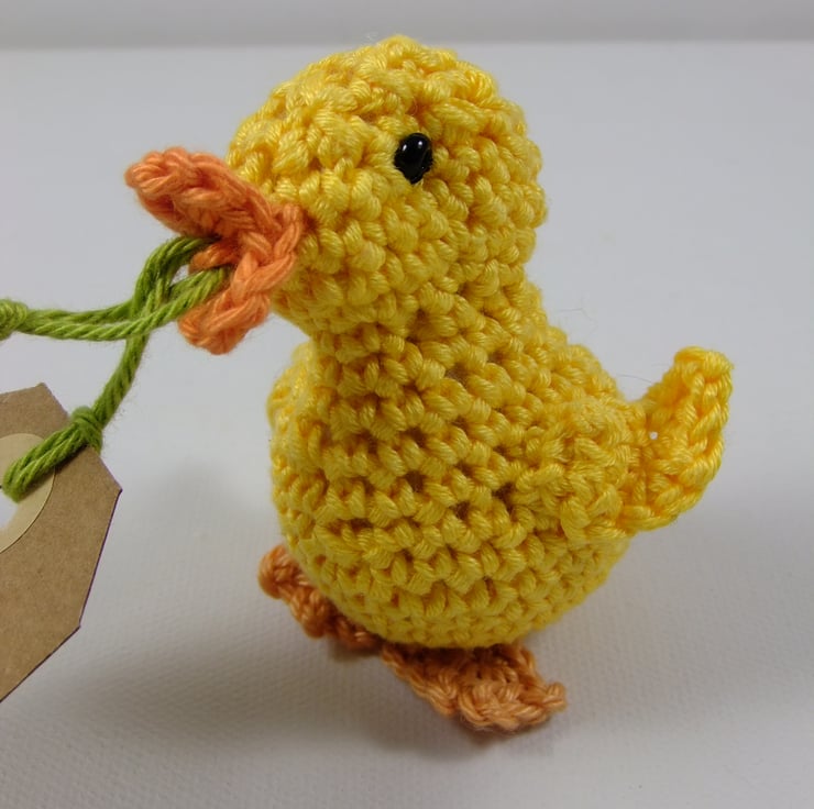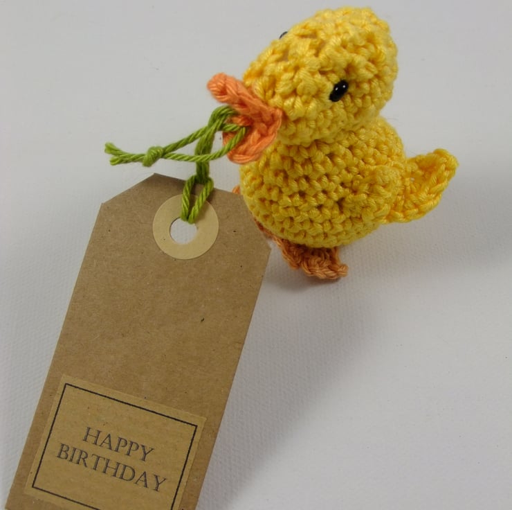 An alternative to a card, this sweet little duckling carries a message on your behalf! It has been adapted from a pattern by Karla Fitch (itsybitsyspidercrohet.blogspot.com) and crocheted in 100% cotton. It stands approximately 7 cm tall and carries a tag bearing the greeting ‘Happy Birthday!’ (though I’m happy to exchange this for a tag with a message of your choice.) It comes wrapped in tissue and in a labelled PIP (Posting in Proportion) box. It can therefore be posted as a large letter rather than as a parcel; it may just need a little plumping up on arrival!