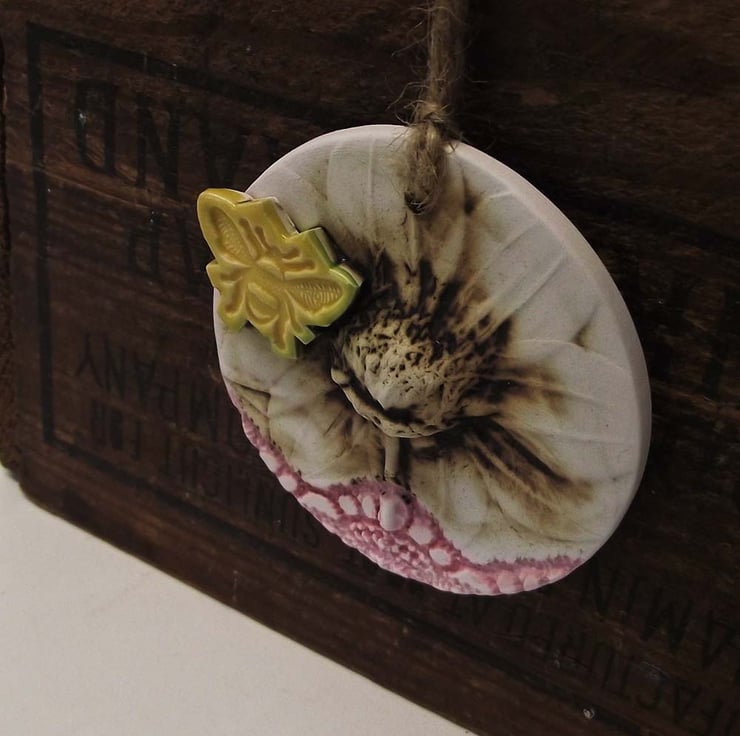 This cute little hanging decoration has been made from white earthenware clay where it has been decorated with a flower design and then fired twice.