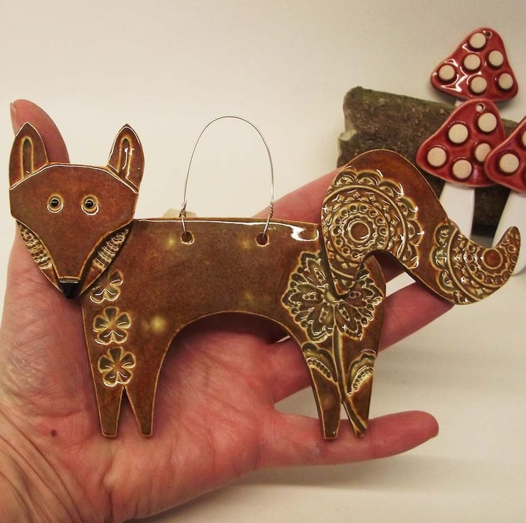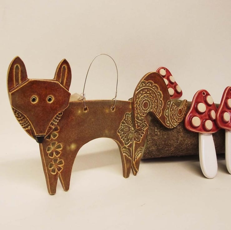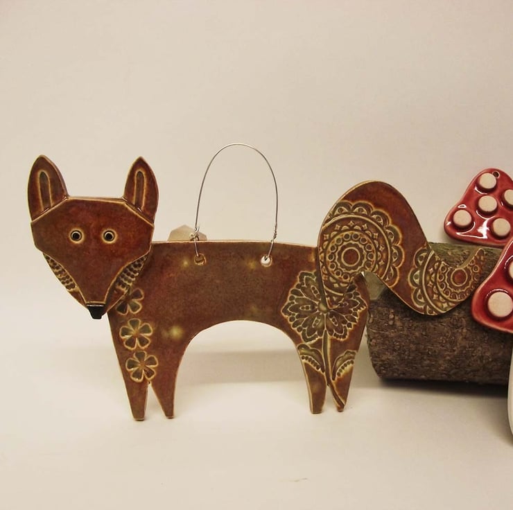 This cute little fox is made from white earthenware clay and decorated in a folk art style.