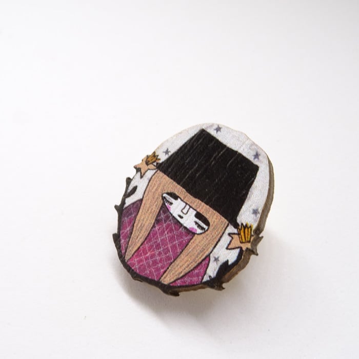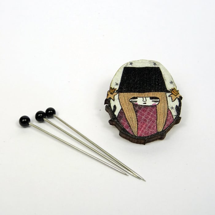 Twinkle & Gloom's original drawing as been printed onto 3mm Plywood and has been laser cut to size. The back features a 1cm brooch back, secured in place. Each brooch is packed onto printed Twinkle & Gloom packaging and it protected in a cellophane bag.