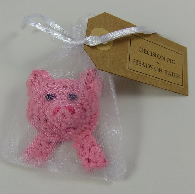Do you know an indecisive fan of pigs? (Fairly niche I know!)This little piggy could help! Toss this tiny (approximately 4.5 cm in diameter) beanbag into the air and see whether it lands heads or tails up. The pig is crocheted in cotton and filled with plastic ‘beans’ securely sewn inside a fabric casing. The tag attached to the gauze bag it comes in, reads, 'Decision Pig Heads or Tails?' the other side of the tag is blank for your own greeting.